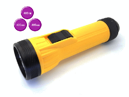 | 【405nm 紫外線 5mm径 UV-LED×3灯搭載/単1電池×2本】ハンディライト:HLK-2C-3LED-405UV |