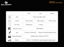 - High mode: 1700 lumens /150 minutes