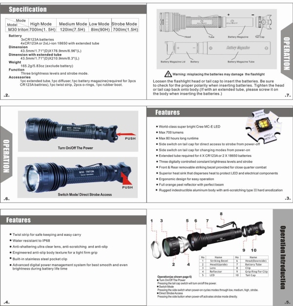 batteries 4xCR123A or 2xLi-ion 18650 with extended