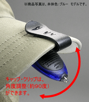 | カラビナ・フックとキャップ・クリップが付属しています。シーンに合わせて付け替えることができます。キャップ・クリップは、帽子のツバに簡単に取り付けることができるのでとっても便利!! |