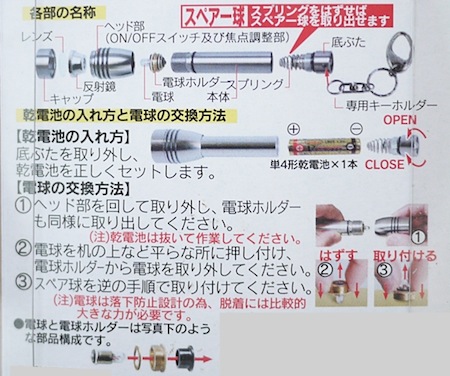 0.5A、スペアー球1個、単4形電池×2本、キーホルダー