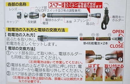 0.45A、スペアー球1個、単4形電池×2本、キーホルダー