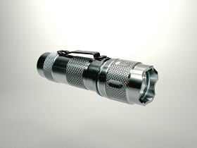 は、スーパー 3W−LED搭載の小型ライトです。全長は、約93mmです。日常で手軽に携帯できるコンパクト・サイズですね。電源は、CR123A電池×1本使用です。近距離を十分な明るさで照らすことができます。点灯・消灯方法は、エンド部プッシュ式です。点灯モードで、プッシュ・ボタンを軽く『押す→離す→押す→』で間欠点灯操作ができます。本体部に。金属製クリップが付いています。クリップ部には、ストラップ紐(別売)を通せる穴が開いています。専用ポーチ付属です。本体材料はアルミ合金です。