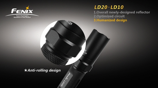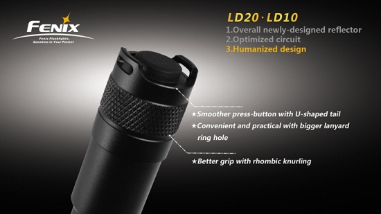 FENIX LD20 は、 Cree 7090 XR-E Q5 搭載のハンディ・ライトです。ヘッド部回転+テール・スイッチ操作で、明るさ調整、ストロボ、SOS