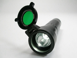 グリーン・フィルターの特長 緑色の光は、赤色と同様に眼球の暗順応(暗闇に慣れる)を、妨げない光のカラーといわれています。白色の強力な光の場合、真っ暗闇で、一旦、点灯させると、再度、暗闇に目が慣れるまで、時間がかかりますね。また、至近距離を照らす場合、強力な光がフィルターを通すことにより、照り返しを少なくすることができ、目の負担を軽減できます。 |