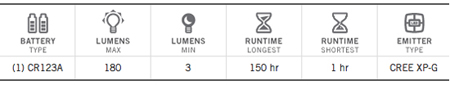 Low: 3 lumens, 150 hrs / Medium: 40 lumens, 8 hrs /