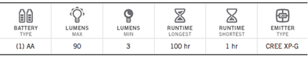 Low: 2.7 lumens, 60 hrs / Medium: 25 lumens, 8 hrs /
