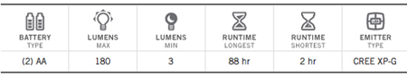 High: 180 lumens, 1.7 hrs |