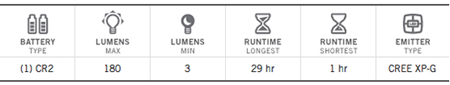 Low: 3 lumens, 1.2 days / Medium: 40 lumens, 4.4 hrs /