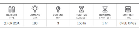 Low: 3 lumens, 150 hrs / Medium: 40 lumens, 8 hrs /