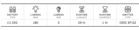 Low: 3 lumens, 1.2 days / Medium: 40 lumens, 4.4 hrs /
