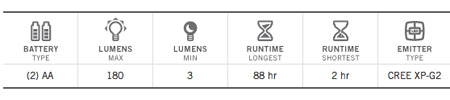 Low: 3.0 lumens, 3.4 days / Medium: 36 lumens, 8.8 hrs /