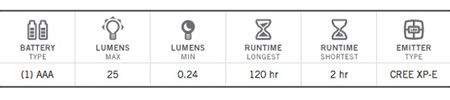 RANGE:1.0V-1.5V ・BRIGHTNESS LEVELS:Low: 0.24 lumens, 120 hrs / High: 25