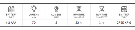 High: 70 lumens, 0.8 hrs |