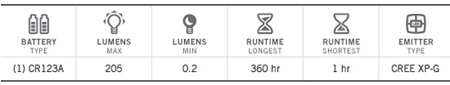 Beacon: 0-205 lumens, 12 hrs |