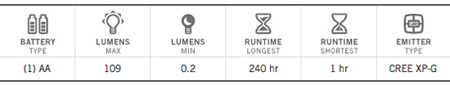 Beacon: 0-109 lumens pulse, 18 hrs |