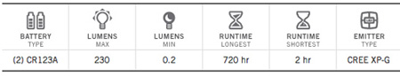 Beacon: 0-230 lumens pulse, 23 hrs |