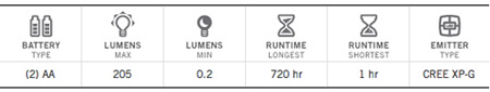 Beacon: 0-205 lumens pulse, 18 hrs |