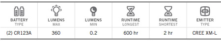 High: 160 lumens, 4 hrs / Maximum: 360 lumens, 1.7 hrs |