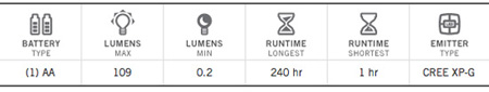 Strobe: 109 lumens, 2.5 hrs / SOS /