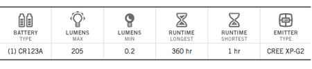 Beacon: 0-205 lumens, 12 hrs |