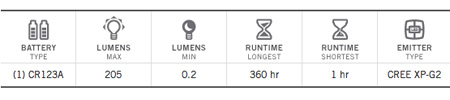 Strobe: 205 lumens, 1.6 hrs / SOS /