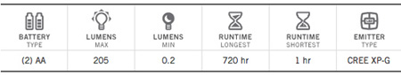 SOS / Beacon: 0-205 lumens pulse, 18 hrs |
