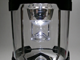 塔載のランタンです。電源は、単1アルカリ電池×3本使用です。連続点灯時間は、約100時間(点灯:100%モード時)です。照射部には、より広範囲をムラなく照らす円錐形反射鏡を採用。点灯・消灯方法は、本体側面のプッシュ・スイッチ式です。スイッチを押すと点灯(100%)→点灯(50%)→点灯(25%)→消灯の切替ができます。また、スイッチを5秒長押しするとフラッシュ点滅になります。雨にぬれても安心の防滴構造です。