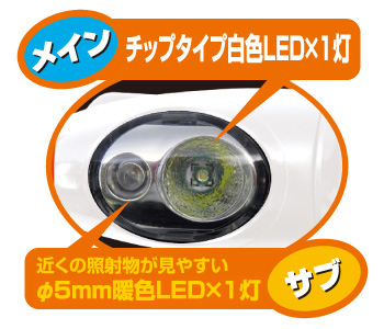 サブLEDに暖色を採用し、手元の照射物を見やすく照らします。 |