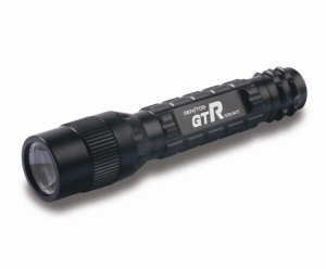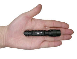 搭載の小型ライトです。アルミ製ボディが特長です。照射部に特殊レンズが搭載されており、集光性が高められています。電源は、単4アルカリ電池×1本使用です。点灯・消灯方法は、テール部のプッシュ・ボタンで操作します。グリップ部には、滑り止めのカッティング加工が施されています。脱着式ハンドストラップ・ネックストラップが付属です。 |