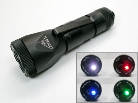 は、砲弾型白色LED×1灯塔載のアルミ製小型ライトです。ヘッド部の回転式4色(ホワイト⇔レッド⇔ブルー⇔グリーン)カラー・レンズを回転させることで、照射光のカラーを変えることができます。機能的でユニークなシステムですね。電源は、単3アルカリ電池×1本使用です。単3アルカリ電池は、安価で、どこでも購入できるので、とても経済的ですね。点灯・消灯方法は、エンド・キャップ部回転式です。金属製クリップが本体グリップ部に装着されています。エンド・キャップには、ストラップ紐を通せる穴が開いています。※金属製クリップは、取り外しが可能ですが、予め、しっかりと取り付けてありますので、取り外しの際、本体部に、多少傷が付きますのでご了承ください。 |