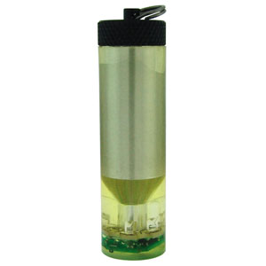 | GLO-TOOB FX7 は、円筒形小型・軽量・頑丈なシグナル・ライトです。内部に砲弾型黄色LEDが搭載されています。連続点灯、フラッシュ、SOSなど、7モード切替式で、使用状況に合わせて選べます。使用電池は、12V:23A規格アルカリ電池×1本です。点灯・切替は、上部キャップ回転式です。上部キャップ部に、金属リングがついているので、いろいろな場所に吊り下げることができます。完全防水のボディは、たいへん頑丈に作られていますので、アウトドア、ダイビングで十二分に活躍します。 |