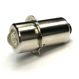 | フランジ型のパワーLED搭載の交換球です。使用電源は、1.5Vアルカリ電池2個(3V)〜6個(9V)まで対応しています。中心電極が+極(正極)です。 |