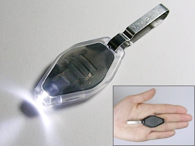 は、砲弾型白色LED×1灯搭載の小型ライトです。近距離(鍵穴を照らす場合など)の照射に役立ちます。電源はボタン電池CR2016を2枚使用です。点灯方法は、カバー部を押すと点灯します。離すと消灯します。また、裏面スイッチをスライドすると連続点灯します。金属製クリップが付属しているので、鍵などを取り付けることができます。電池交換できます。 |