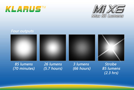 light 4. Max output: 85 ANSI Lumens on high. 5. Max run time: 66