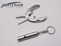 LED LENSER COMBINATION SET は、砲弾型白色LED×1灯搭載ライトと折畳式コンパクト・ツールのセットです。メタリック・デザインが特長です。LEDライトの電源はボタン電池LR41を4個使用です。点灯・消灯方法は、ボディ部のプッシュ・ボタンで操作します。プッシュ・ボタンを押していると点灯します。離すと消灯します。折畳式コンパクト・ツールは、プライヤー、はやみ、ドライバーなど、5種類の機能が搭載されています。金属製リングが付属しているので、鍵などを取り付けることができます。