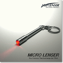 | LED LENSER MICRO LENSER マイクロ レンサー は、砲弾型赤色LED×1灯搭載の小型ライトです。近距離(鍵穴を照らす場合など)の照射に役立ちます。電源は、リチウムBR435※1電池を1本使用です。金属製リングが付属しているので、鍵などを取り付けることができます。点灯消灯方法は、エンド部回転式です。 |