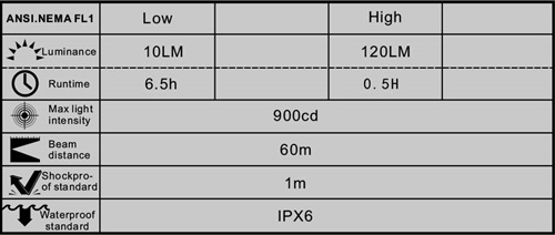 High 120 lm 0.5hrs.