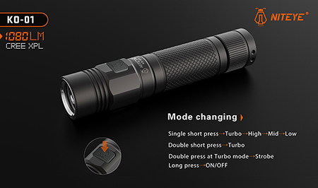 ・Turbo: 1080 lumens / 1 hours (CR123A battery) / 960 lumens/2 hours(18650 battery)