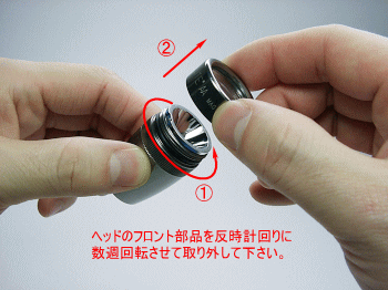 ヘッド部の、フロント部品を反時計回りに数周回転させて取り外してください。