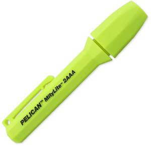 Yellow. Submersible to 500 feet. Focused beam that is 400% brighter than