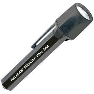 6.25 in. made of unbreakable chemical resistant resin with a polycarbonate lens and thermoplastic rubber shroud. Xenon bulb has 20 hours of lamp life and 8000 candlepower. Has a pre-focused Xenon Laser SpotTM lamp module, shirt clip and 2-AA Alkaline batteries for 3 hours at 50 degrees. MityLite Plus 2AA has a tail button switch with one push for on/off or intermittent lighting.