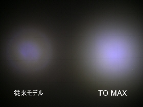 モデルは、照射部LED側面がカバーで覆われています。照射光の広がりが抑えられるので、多少、照射パターンがスポット状になります。 |
