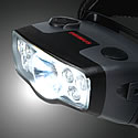 は、近距離の照射に適した砲弾型白色LED×4灯、暗闇での眩惑を防止する砲弾型赤色LED×2灯、大光量の1W-Luxeon×1灯を備えた高機能ヘッドランプです。ヘッド部は角度調整ができます。 |