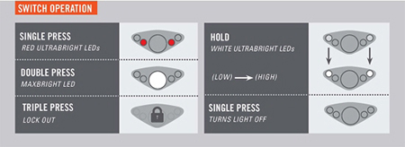 点灯時間MAX:150時間 センター部205ルーメン点等時:1時間 サイド部:砲弾型白色LED2灯MAX点等時:6時間 サイド部:赤色LED:16時間