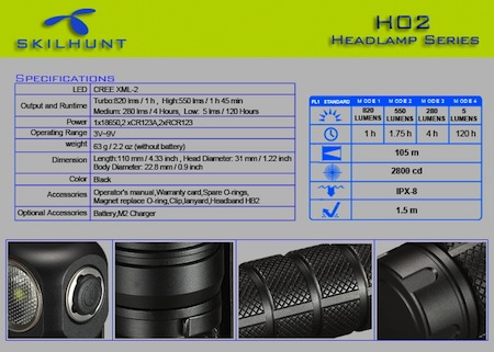 1h High: 550Lumens/1.75h Medium: 280Lumens/4h Low: 5