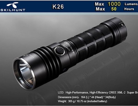 SKILHUNT K26 【CREE XM-L2 LED搭載 / 明るさMAX:1000ルーメン / 充電池:RCR26650 ×1本】