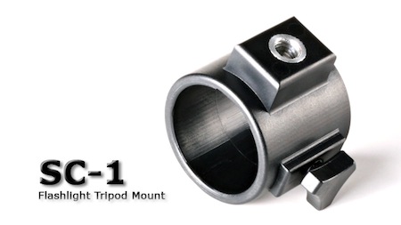 懐中電灯を三脚に取り付けるためのマウントです。 三脚は別売りです。 直径:22-27mmの懐中電灯を装着することができます。 ネジで締めて固定します。