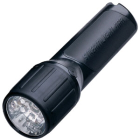 STREAMLIGHT PRO POLYMER 4AA-LED は、砲弾型白色LED×7灯塔載のハンディ・ライトです。軽量・頑丈なポリマー樹脂製です。砲弾型LEDは、省電力で長時間、安定した明るさで照射できます。砲弾型白色LED7灯の光は、手元を十分な明るさで照らします。比較的狭い空間:室内や中距離ぐらいまでの空間を全体的にぼんやりと照らすことができます。電源は、単3アルカリ電池4本使用です。点灯・消灯方法は、エンド部プッシュ式です。軽く押すことで間欠点灯操作ができます。プッシュ式ボタンは、片手で操作ができます。
