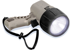 は、6W-LED塔載のハンド・ライトです。握りやすいピストル型グリップ付きで持ちやすいのが特長です。点灯・消灯方法は、回転切替式スイッチです。光の強さを6W(100%)、3W(50%)の切り替えができます。本体主材料は、プラスティック製です。電源は、単2アルカリ電池4本使用です。ストラップが付属です。 |